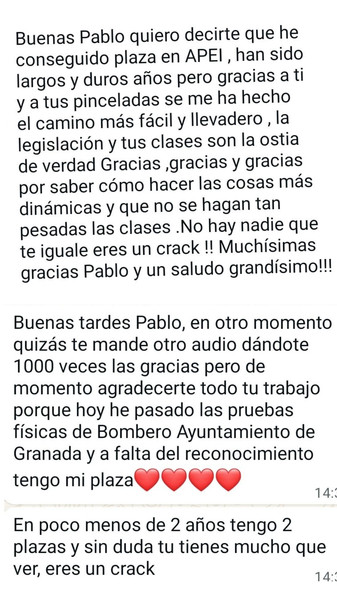 Ex alumno y Bombero de Ayto. de Melilla"Pablo es un profesor y persona excepcional! Su metodología es la mejor para poder aprobar en cualquier sitio, y su plataforma, herramienta fundamental de estudio. Puedo decir que tiene mucha 'culpa' de que hoy yo sea bombero."