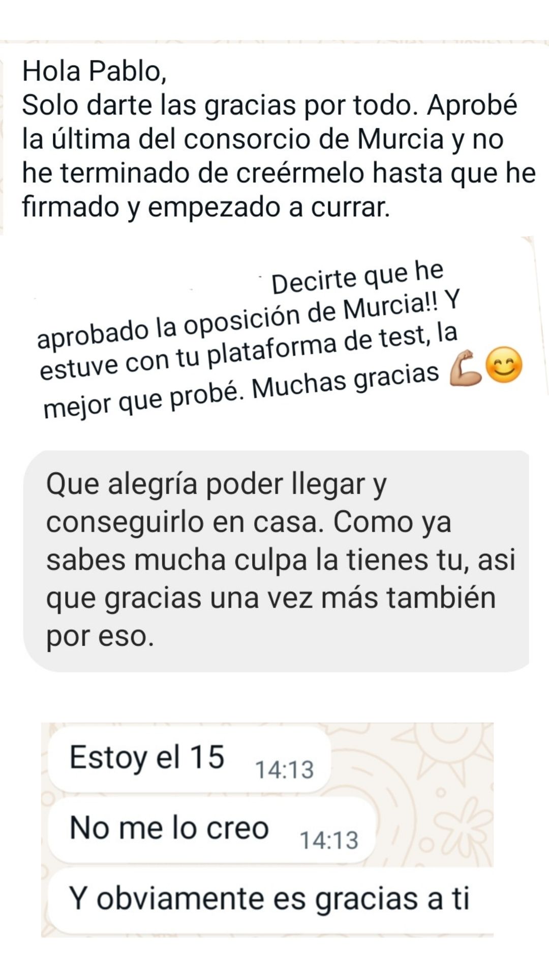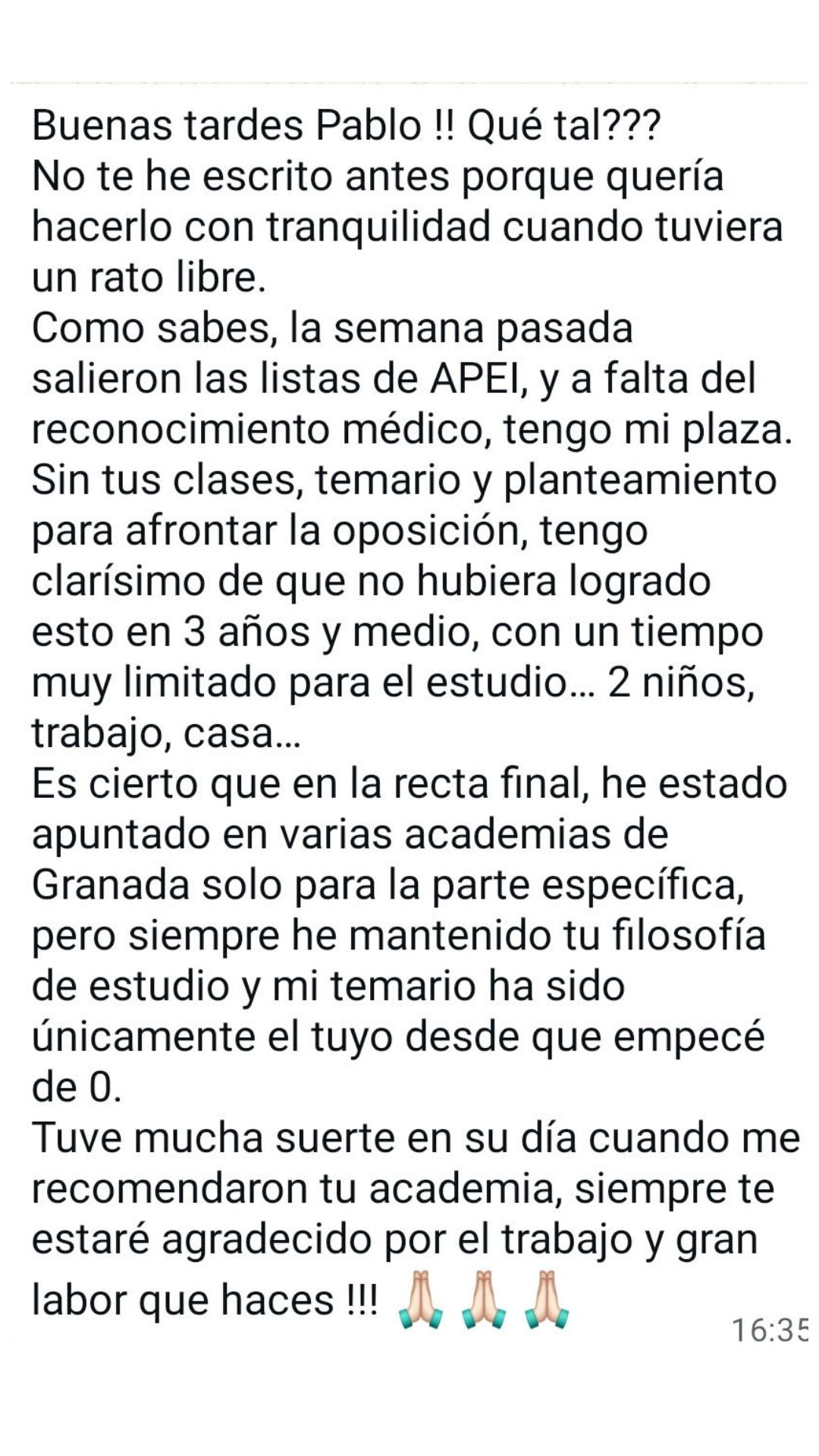 Alumno"Después de muchos años de opositor y de pasar por varias academias no tengo dudas de que es el mejor sitio para prepararse, pues desde que estoy con él he obtenido mis mejores resultados. Pablo se encarga de confeccionar los temas sin marearte y va a lo realmente importante. Y en los resultados de las oposiciones se está viendo que es uno de los mejores preparadores. Lo recomiendo totalmente."