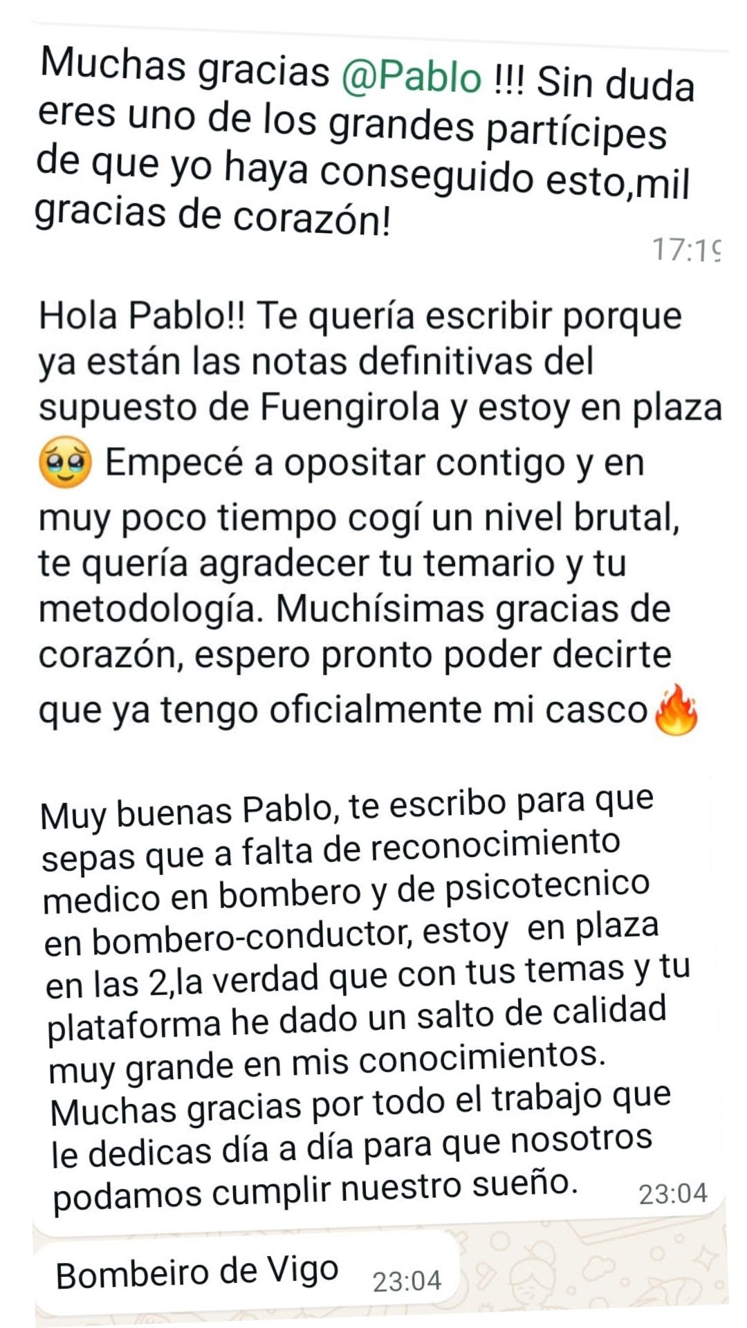 Ex alumno y Bombero de Ayto. de Martos"Gracias a Pablo y a su método de estudio conseguí ver que el temario tenía fin. Me parece fundamental dividir el temario por niveles y adecuar las materias con las preguntas que se ven en los exámenes. Es un tutor que no para de actualizarse y adaptarse a los cambios de las oposiciones. Sólo tengo palabras de agradecimiento para él porque allanó mi camino para que hoy sea bombero."