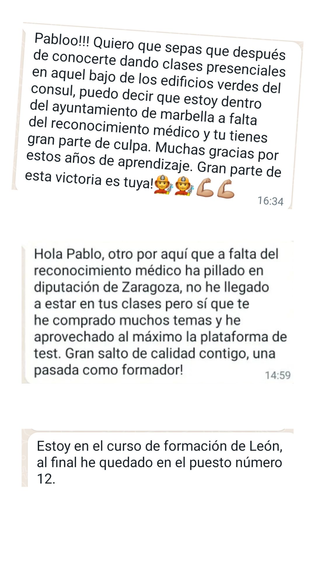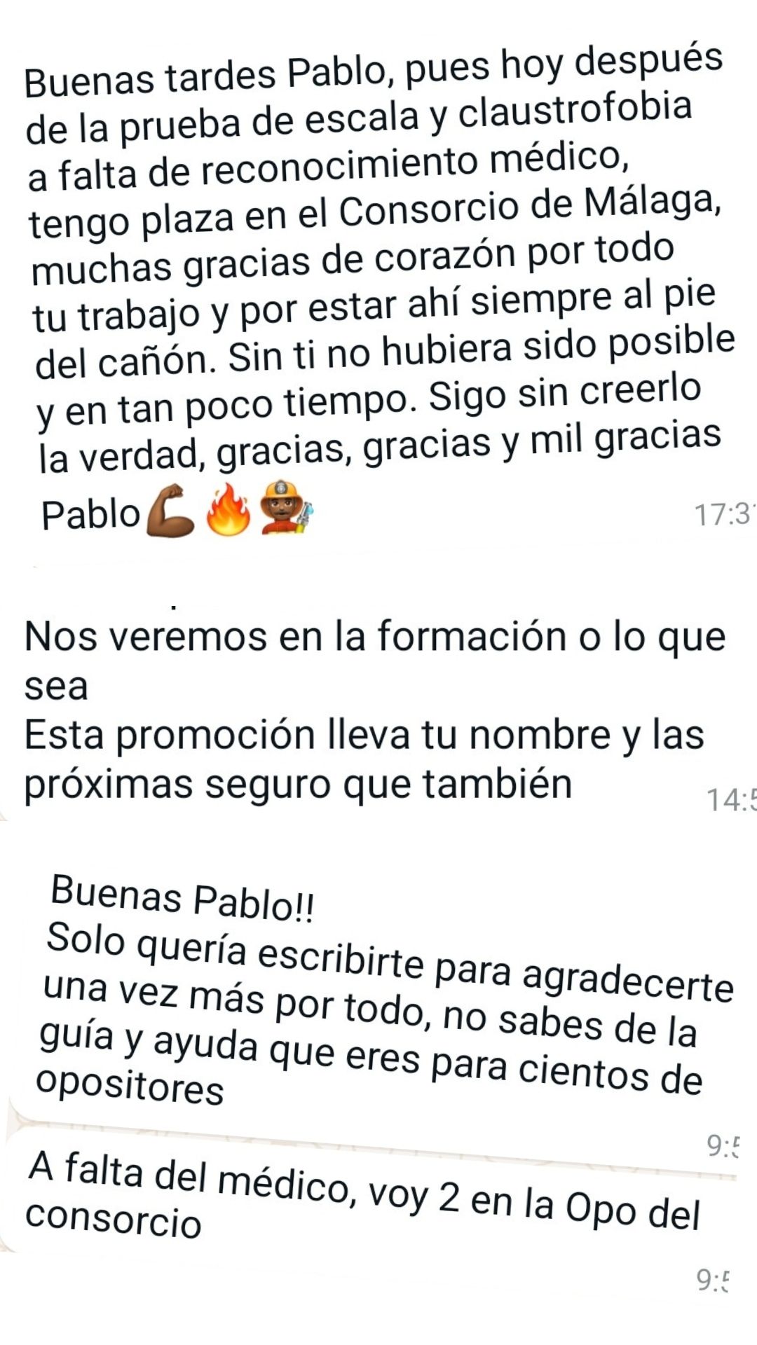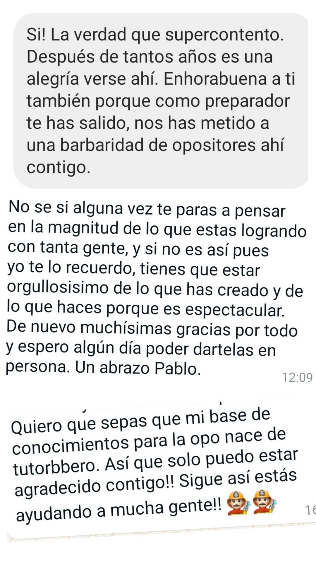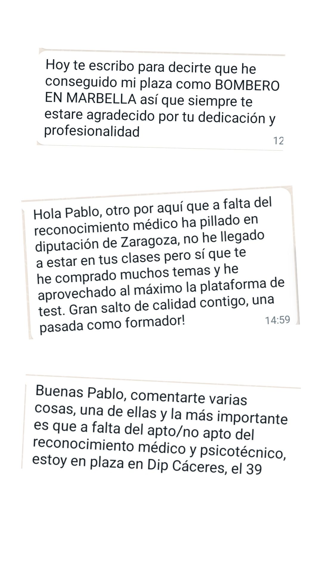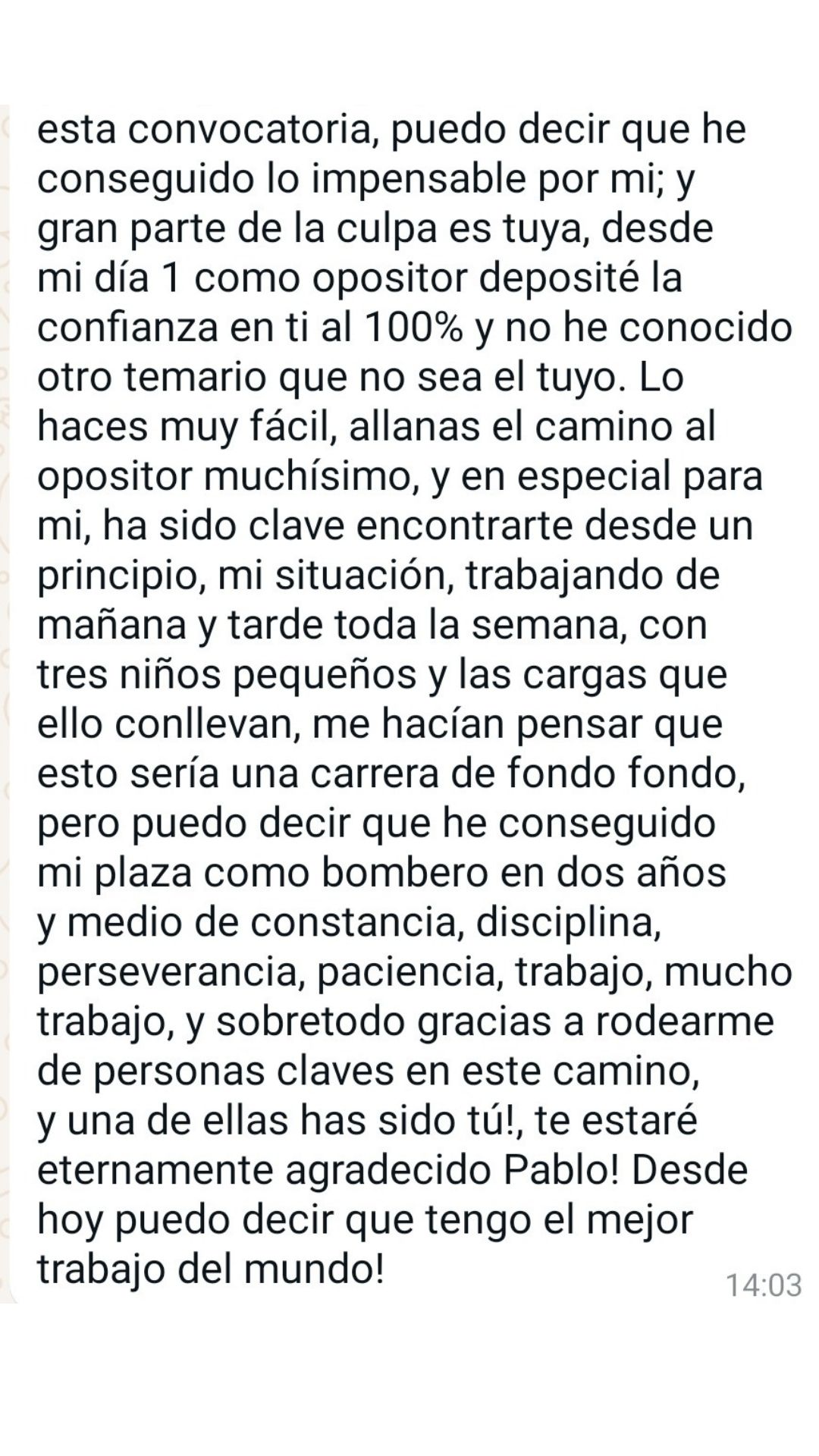 Ex alumno y Bombero de Ayto. de Martos"Gracias a Pablo y a su método de estudio conseguí ver que el temario tenía fin. Me parece fundamental dividir el temario por niveles y adecuar las materias con las preguntas que se ven en los exámenes. Es un tutor que no para de actualizarse y adaptarse a los cambios de las oposiciones. Sólo tengo palabras de agradecimiento para él porque allanó mi camino para que hoy sea bombero."