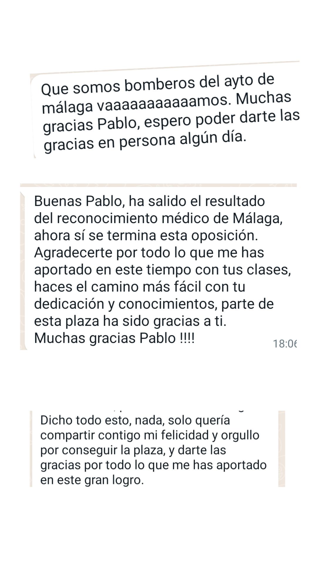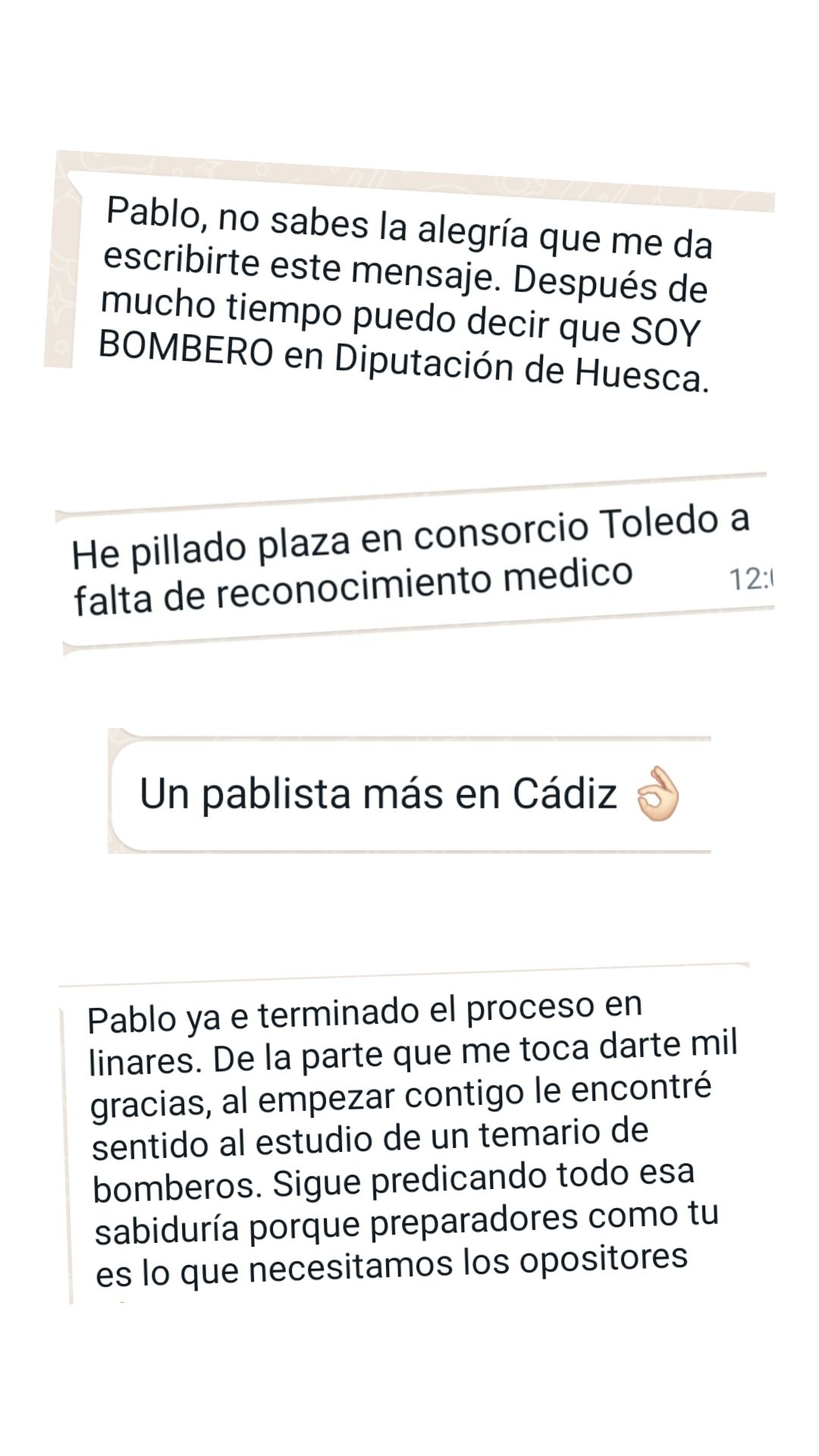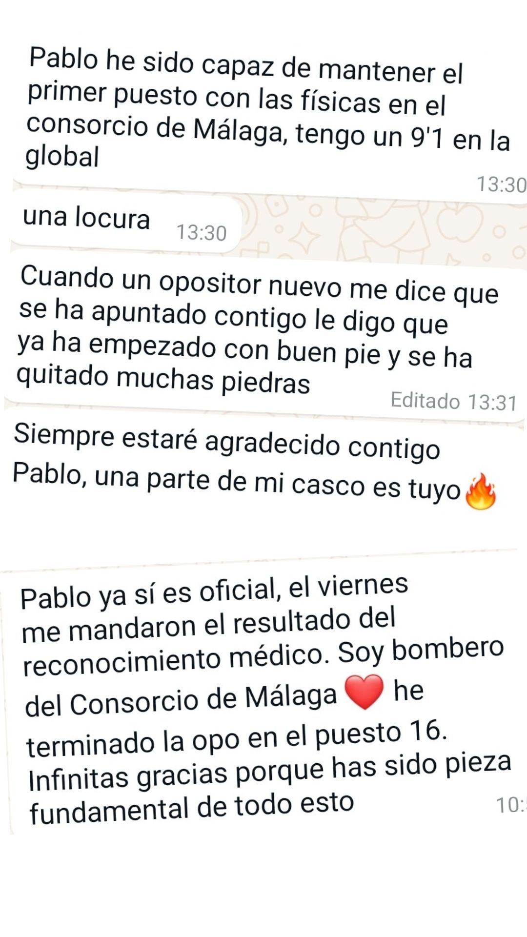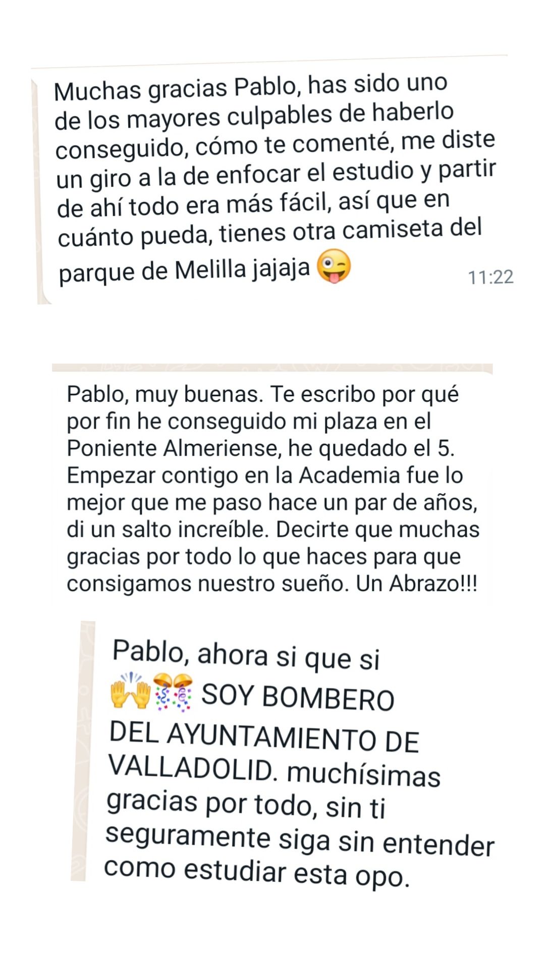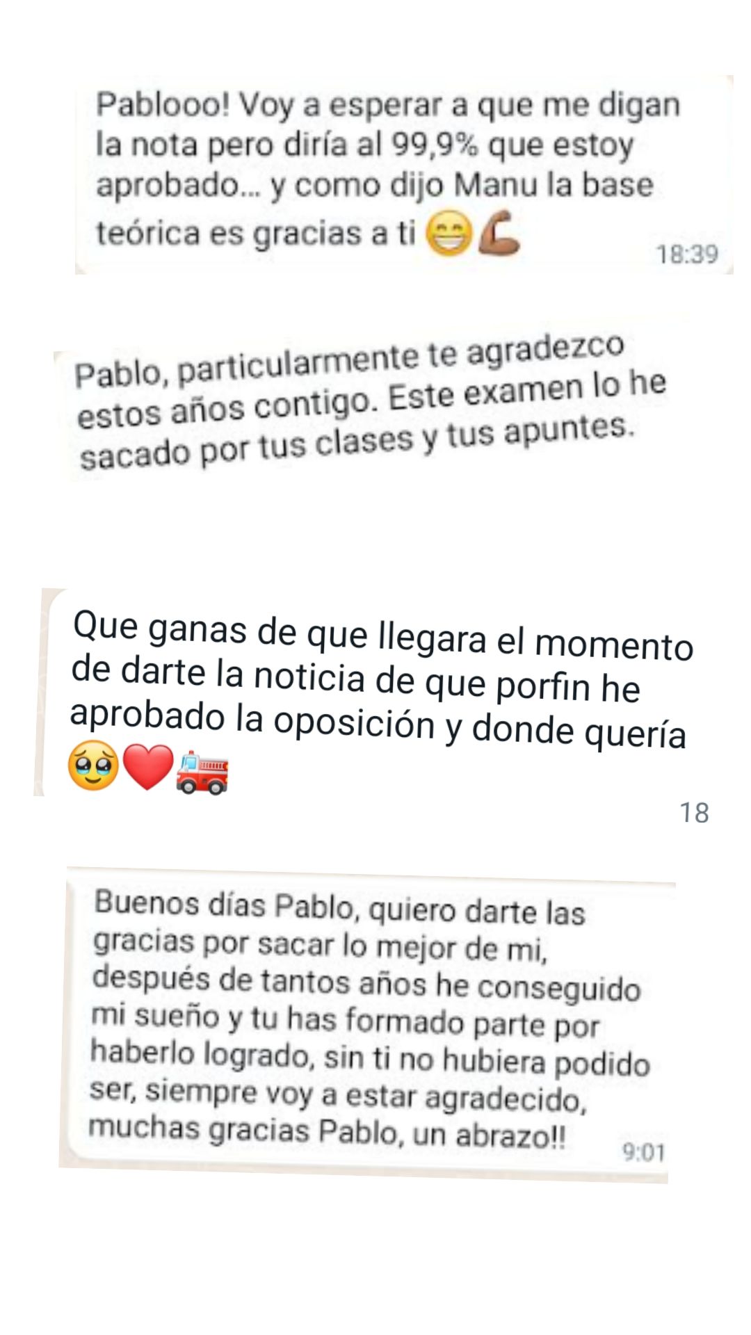 Ex alumno y Bombero de Ayto. de Martos"Gracias a Pablo y a su método de estudio conseguí ver que el temario tenía fin. Me parece fundamental dividir el temario por niveles y adecuar las materias con las preguntas que se ven en los exámenes. Es un tutor que no para de actualizarse y adaptarse a los cambios de las oposiciones. Sólo tengo palabras de agradecimiento para él porque allanó mi camino para que hoy sea bombero."
