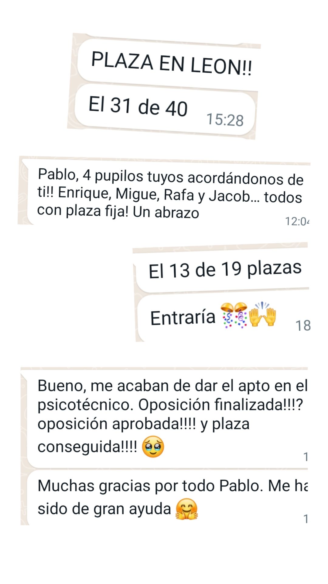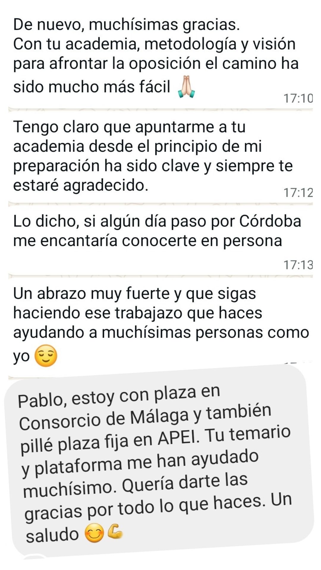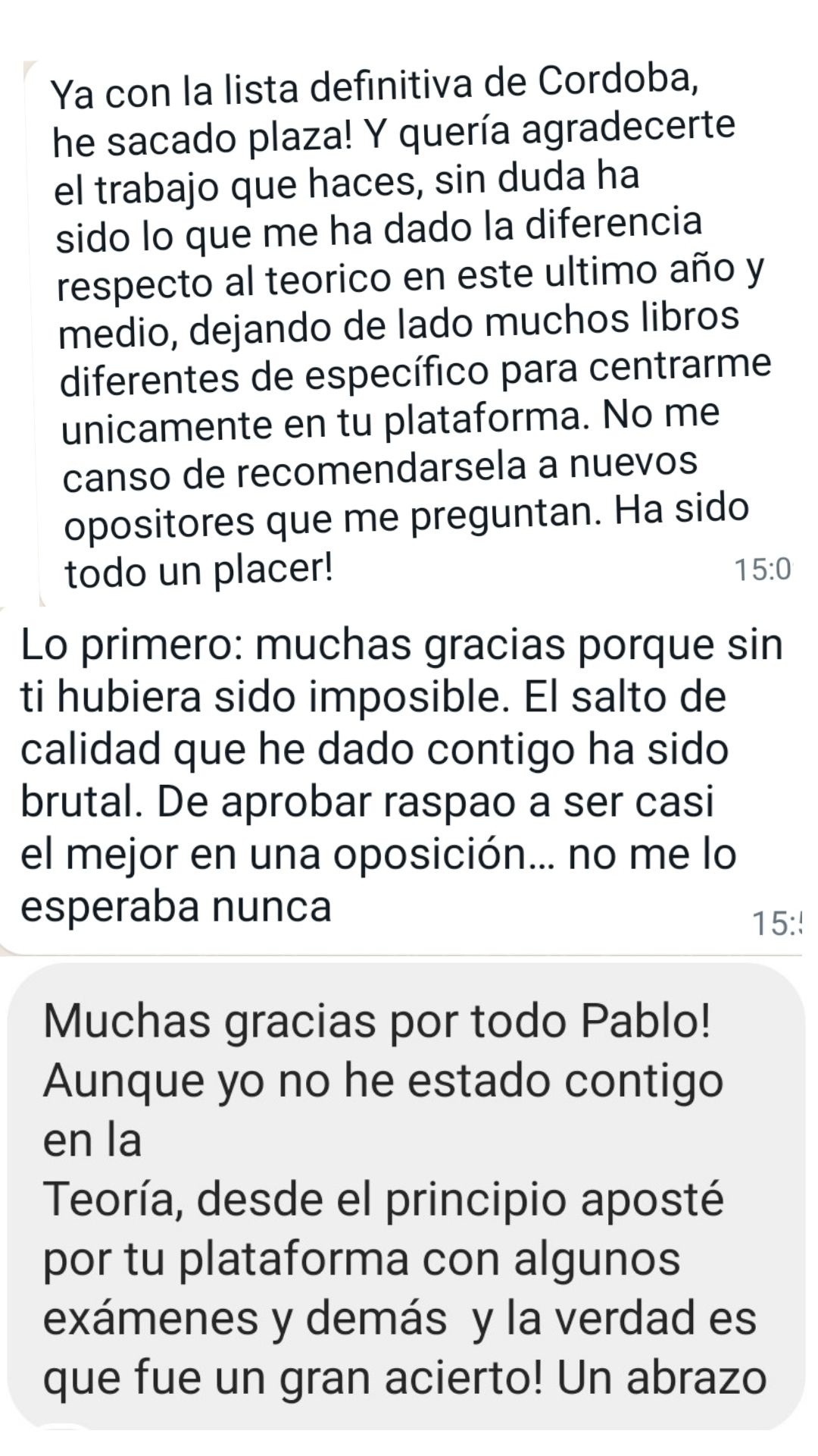 Alumno"Pablo y su plataforma de test es justo lo que necesitaba como opositor: Alguien con mucha experiencia opositando e impartiendo clases. Nos ahorra tiempo centrándonos en lo más preguntable, machacando preguntas y supuestos muy repetidos en exámenes oficiales y la materia esencial para cualquier oposición. Además, todo está en la plataforma con su explicación para poder entender y repasar mejor. Agradezco su gran trabajo y profesionalidad."