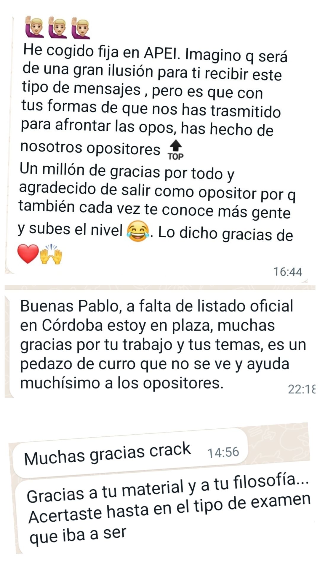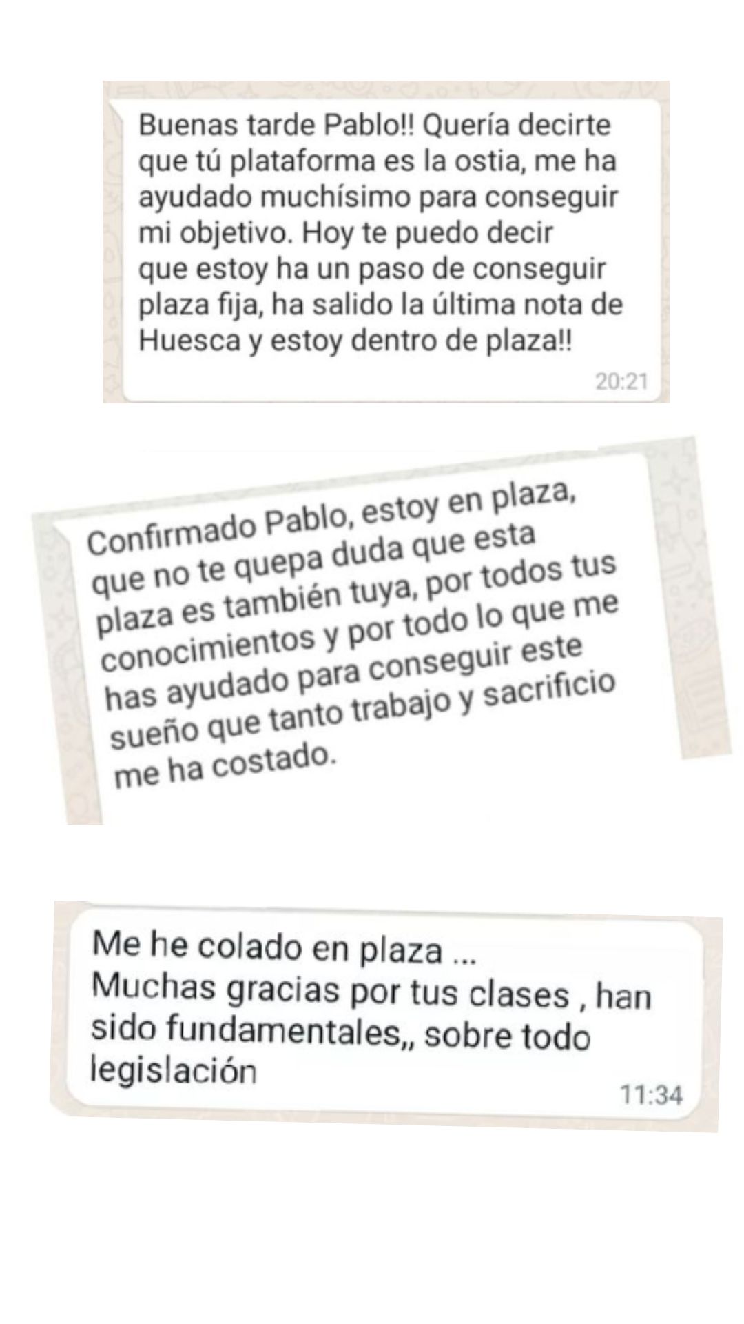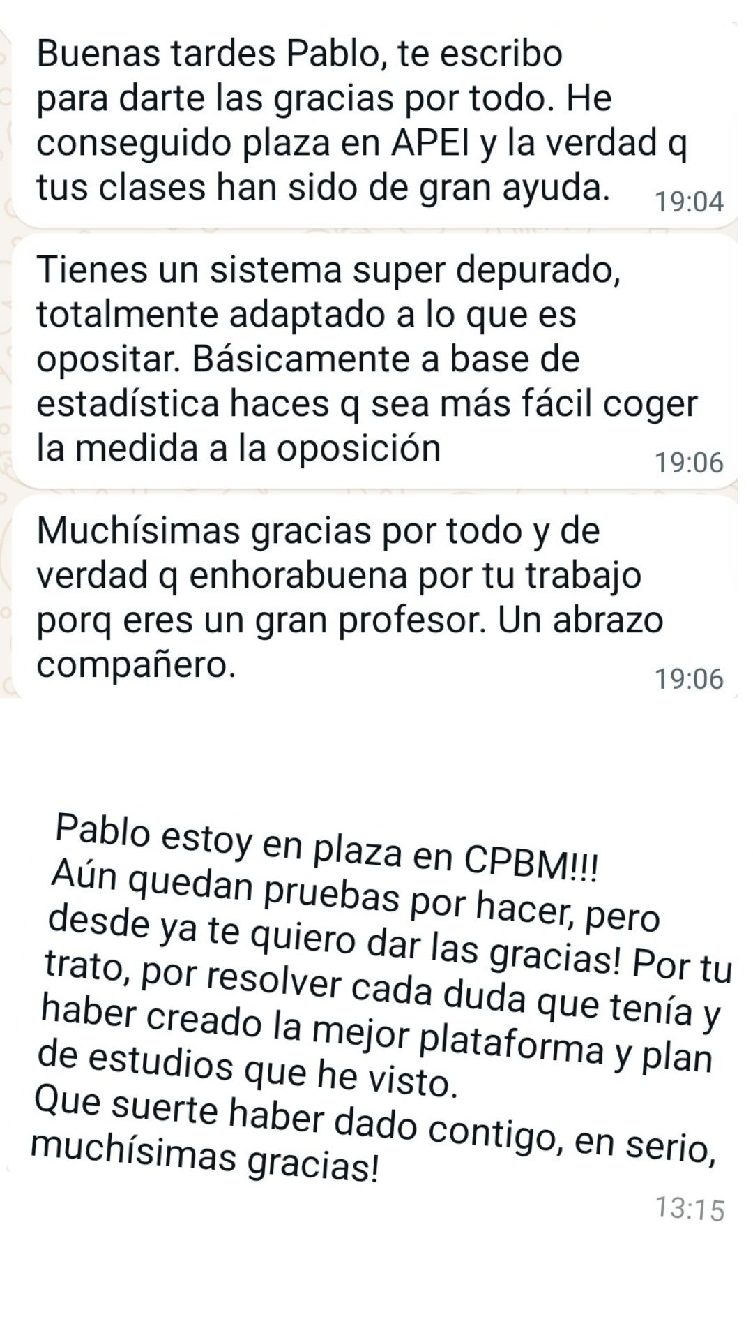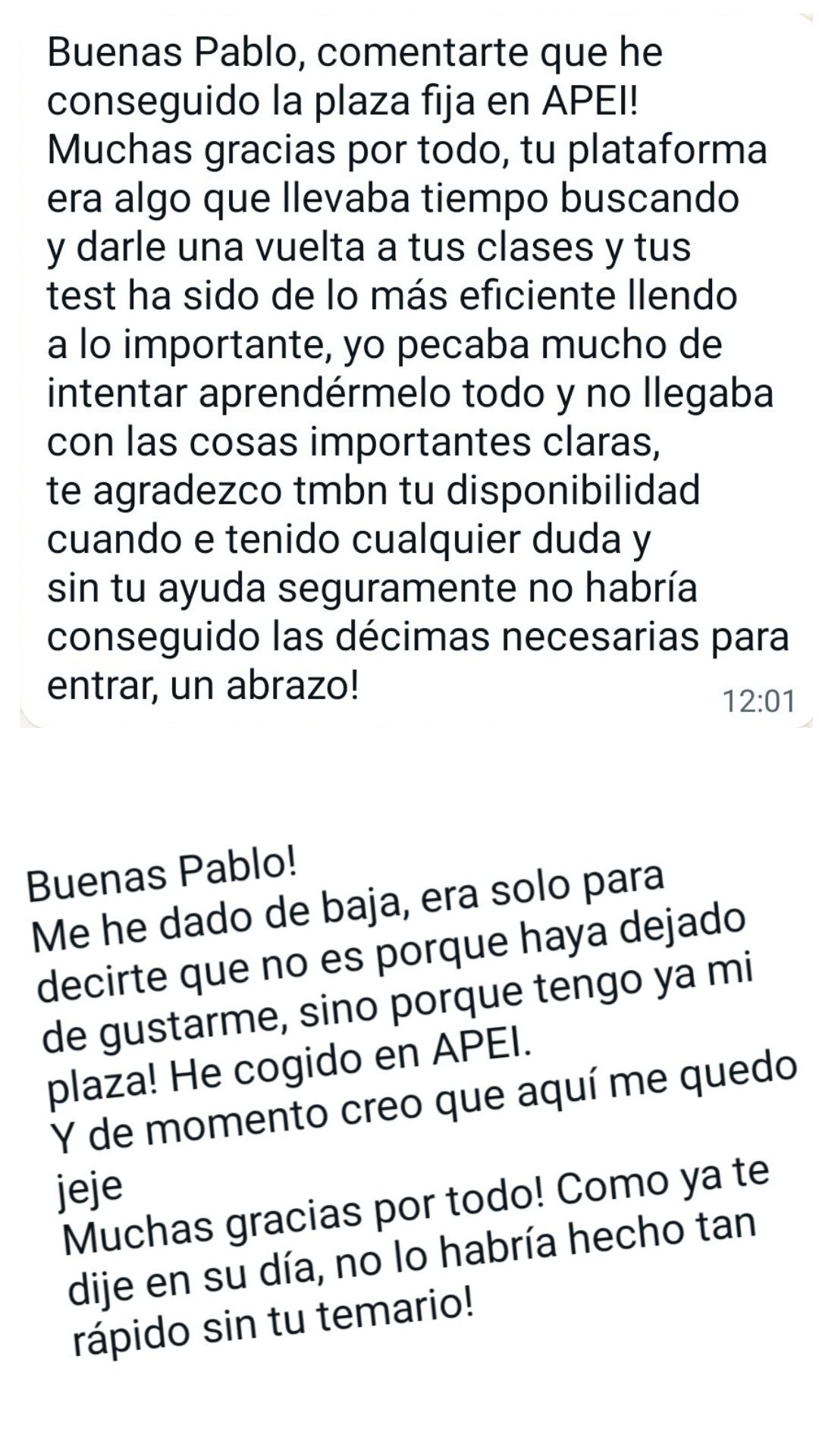 Alumno"Pablo y su plataforma de test es justo lo que necesitaba como opositor: Alguien con mucha experiencia opositando e impartiendo clases. Nos ahorra tiempo centrándonos en lo más preguntable, machacando preguntas y supuestos muy repetidos en exámenes oficiales y la materia esencial para cualquier oposición. Además, todo está en la plataforma con su explicación para poder entender y repasar mejor. Agradezco su gran trabajo y profesionalidad."