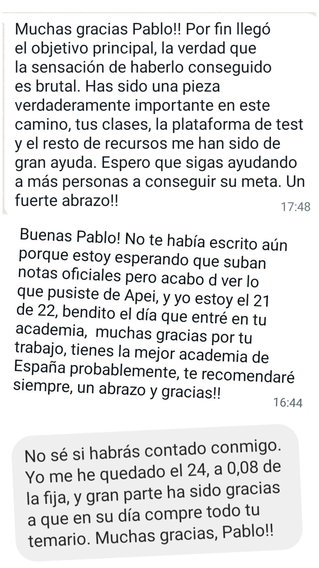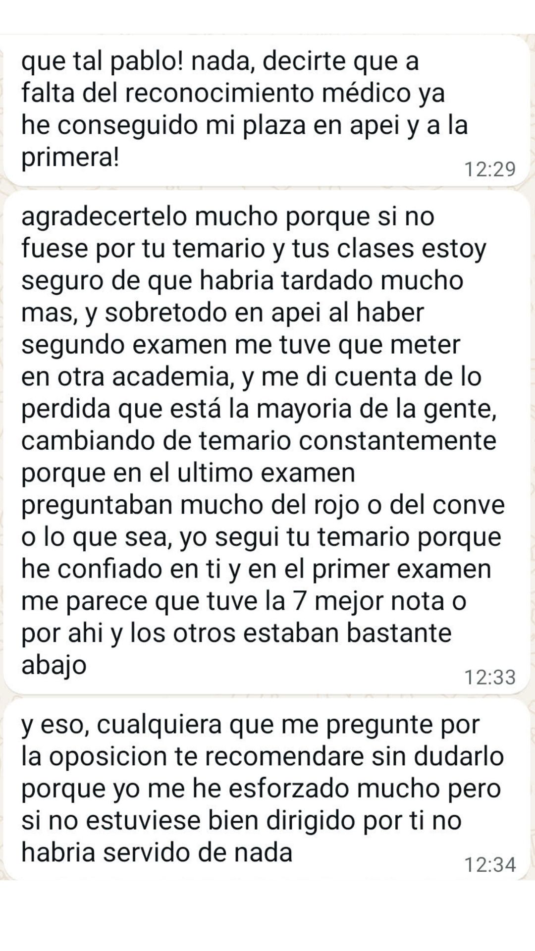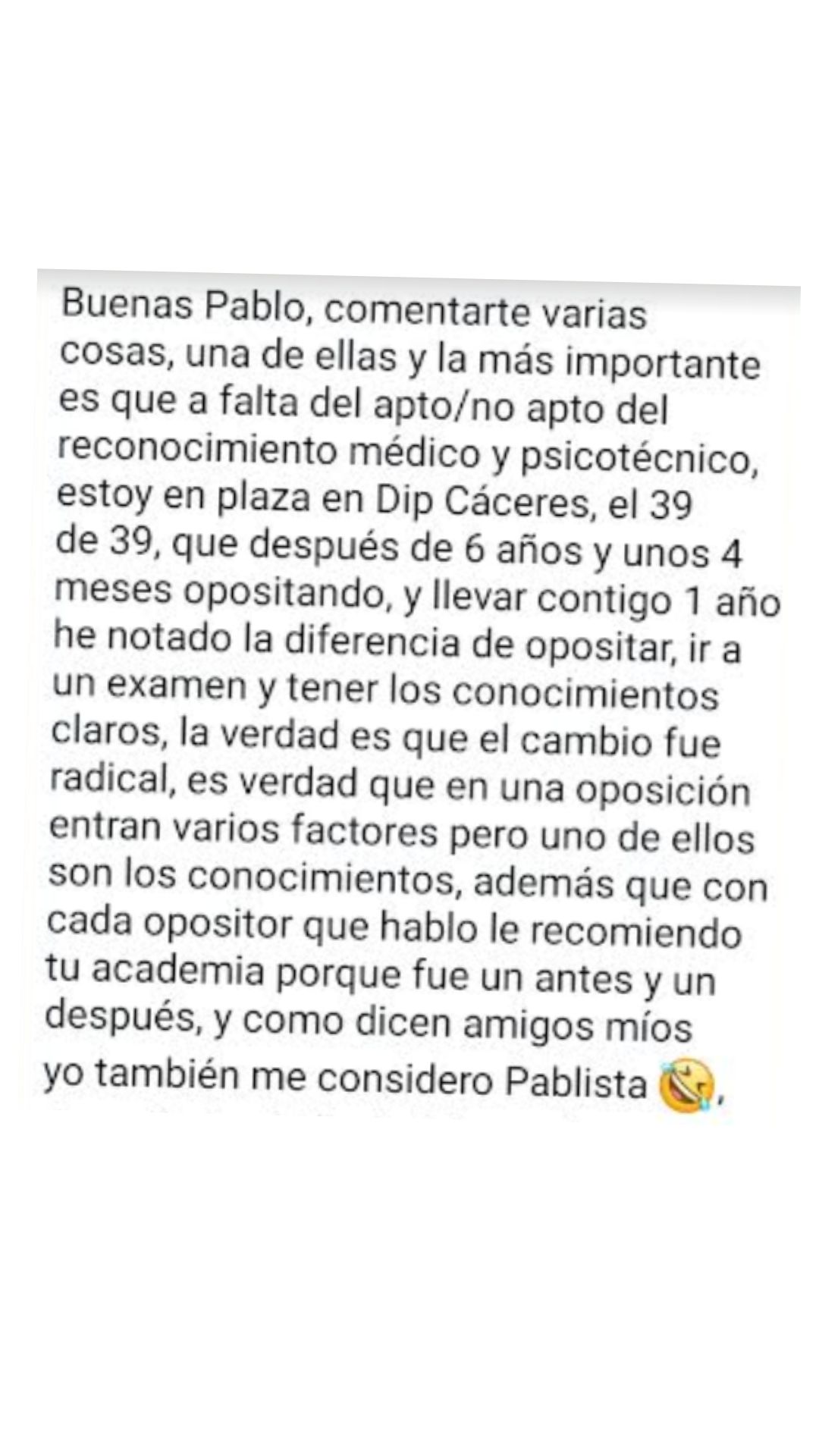 Alumno"Después de muchos años de opositor y de pasar por varias academias no tengo dudas de que es el mejor sitio para prepararse, pues desde que estoy con él he obtenido mis mejores resultados. Pablo se encarga de confeccionar los temas sin marearte y va a lo realmente importante. Y en los resultados de las oposiciones se está viendo que es uno de los mejores preparadores. Lo recomiendo totalmente."