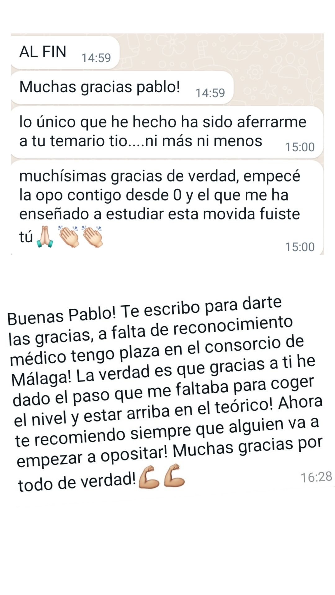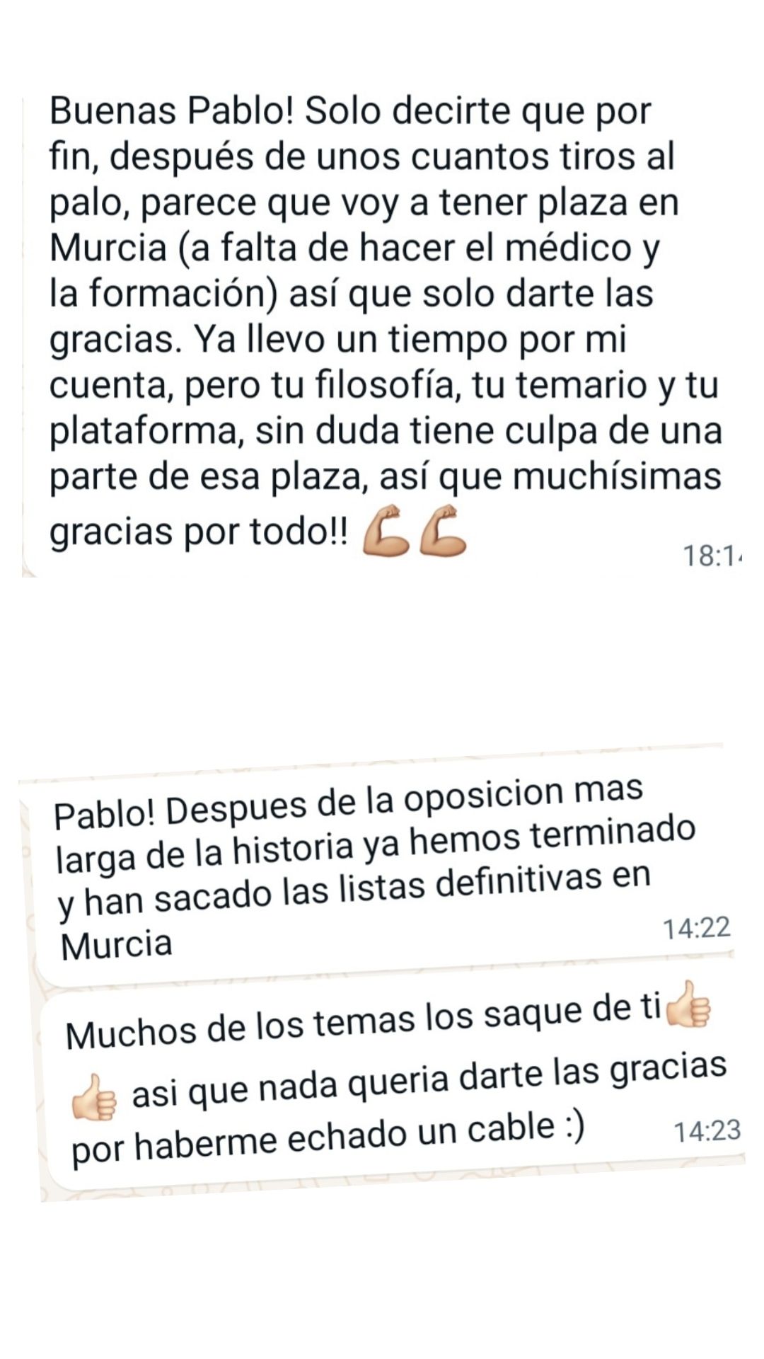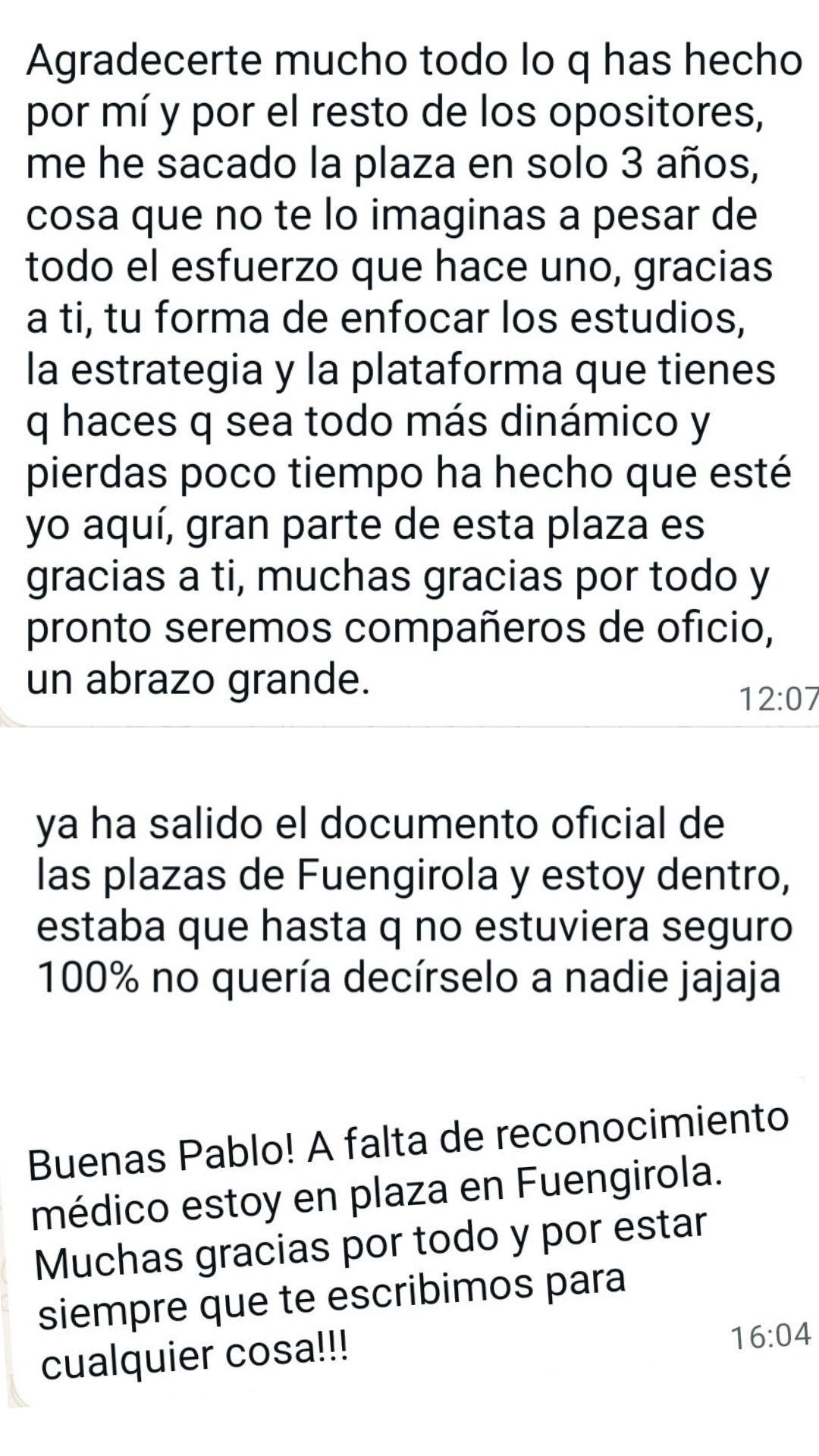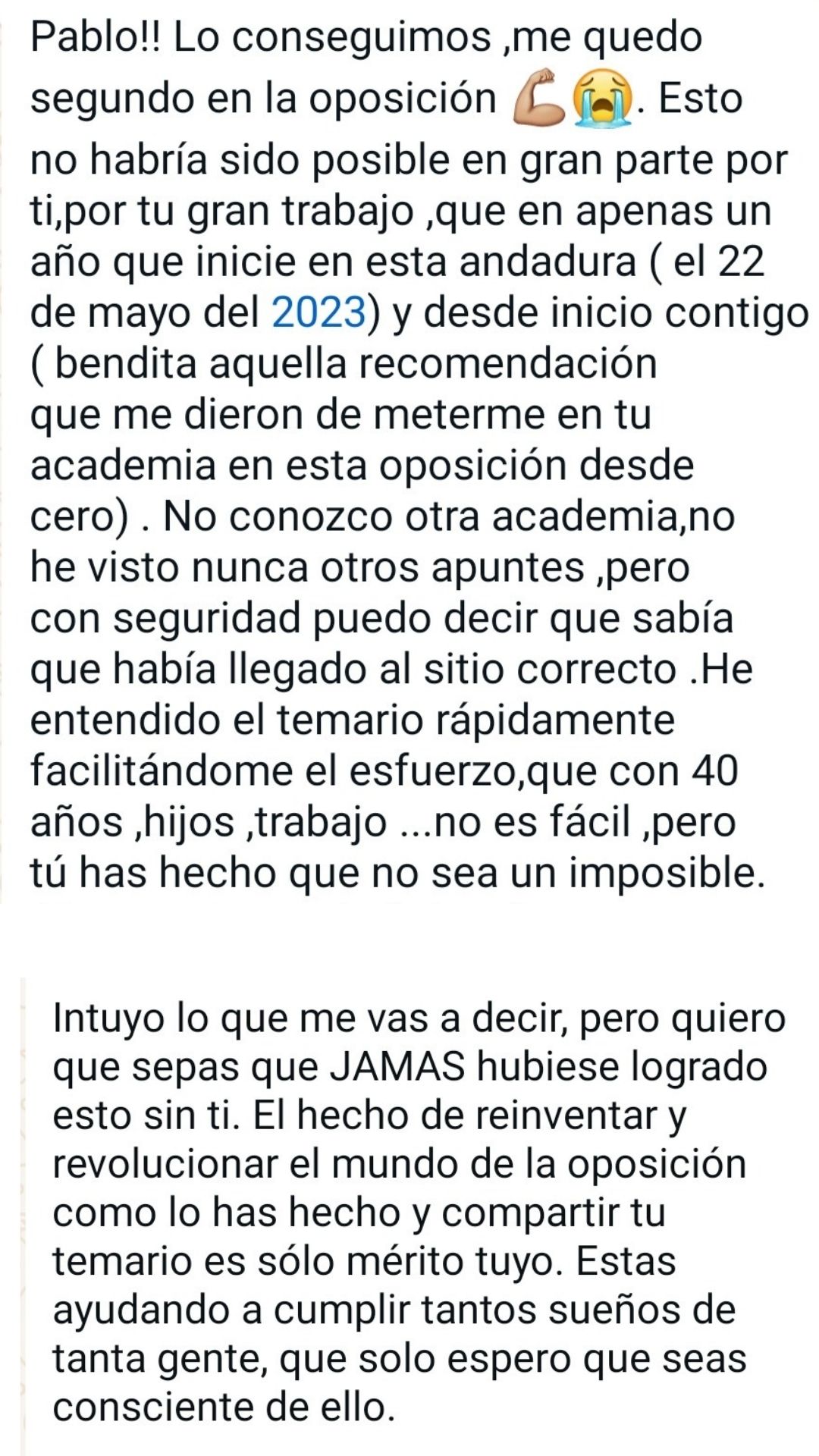 Alumno"Después de muchos años de opositor y de pasar por varias academias no tengo dudas de que es el mejor sitio para prepararse, pues desde que estoy con él he obtenido mis mejores resultados. Pablo se encarga de confeccionar los temas sin marearte y va a lo realmente importante. Y en los resultados de las oposiciones se está viendo que es uno de los mejores preparadores. Lo recomiendo totalmente."