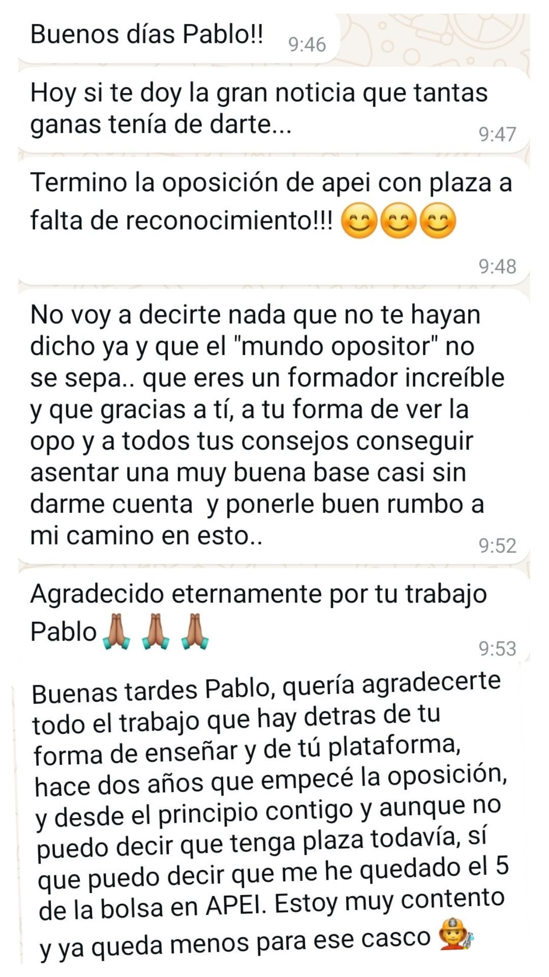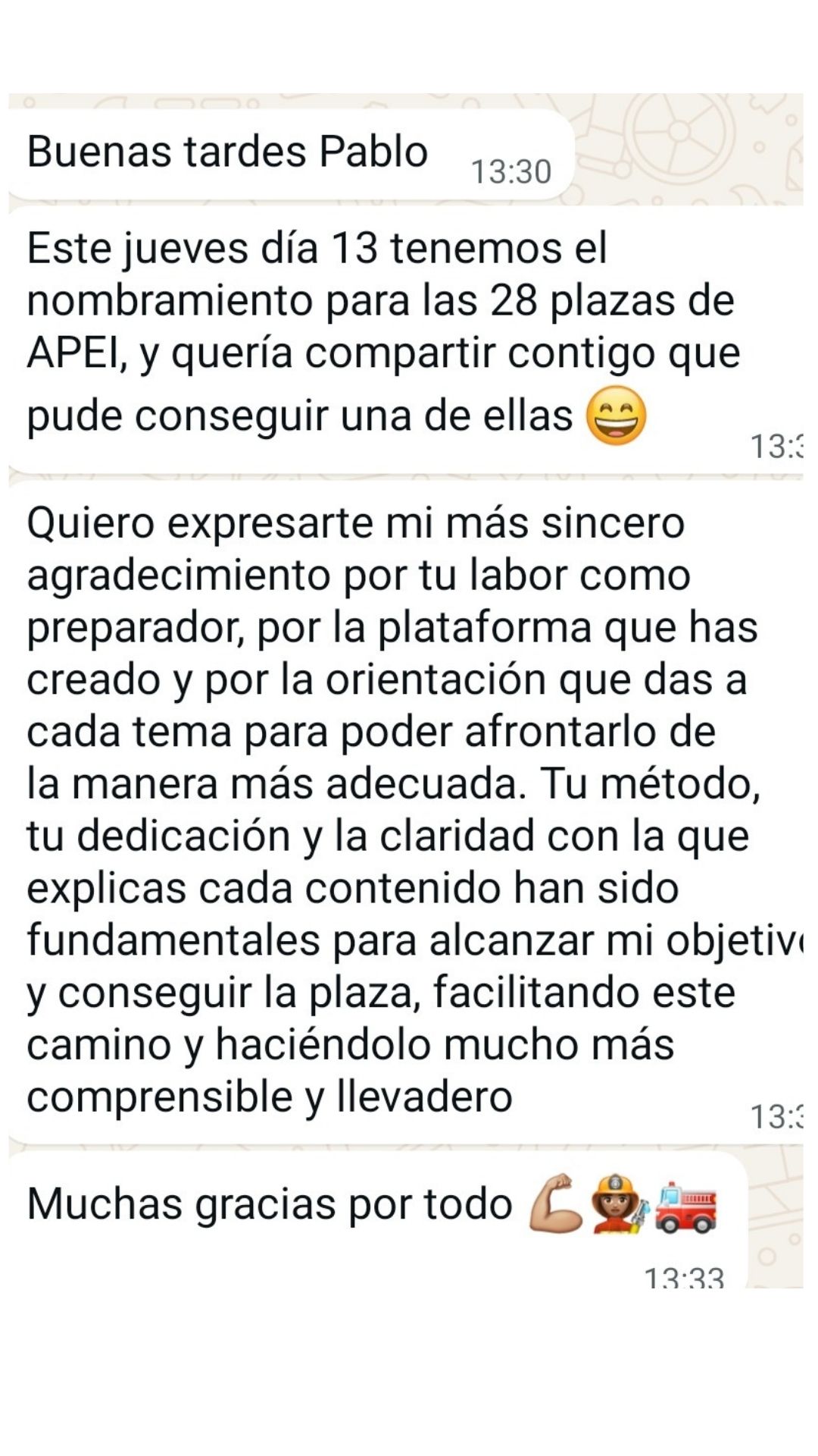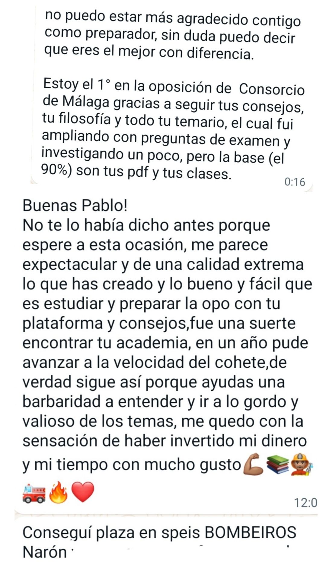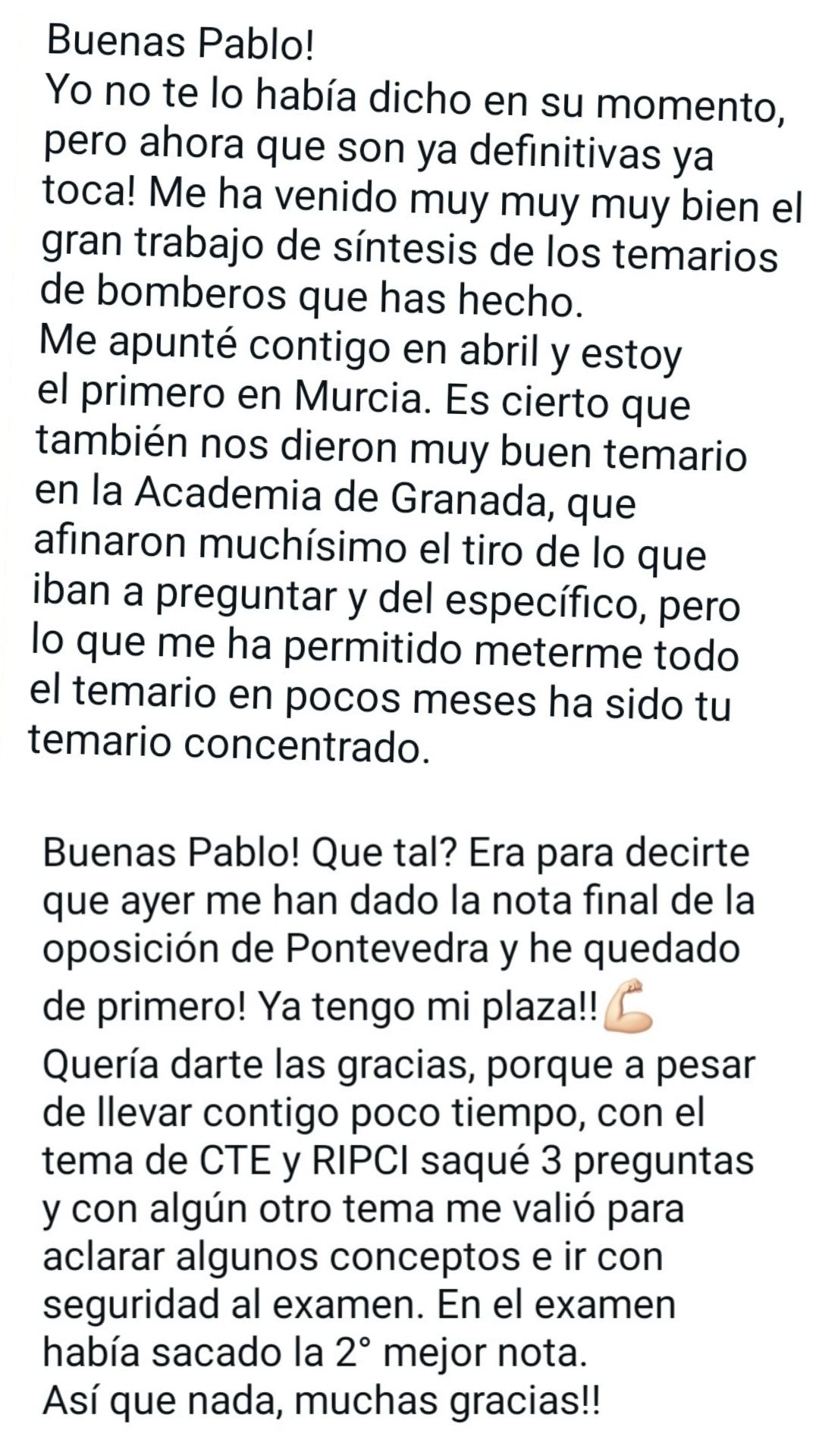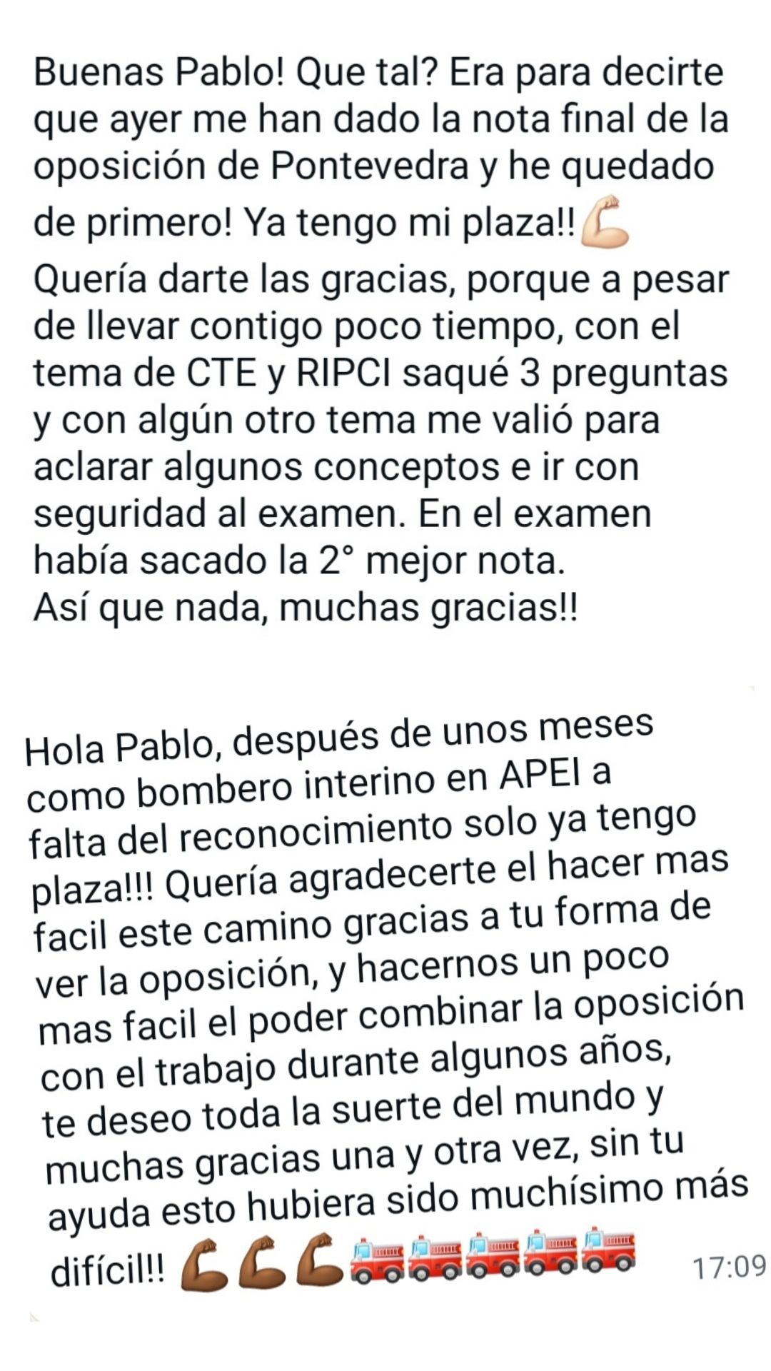 Ex alumno y Bombero de Ayto. de Melilla"Pablo es un profesor y persona excepcional! Su metodología es la mejor para poder aprobar en cualquier sitio, y su plataforma, herramienta fundamental de estudio. Puedo decir que tiene mucha 'culpa' de que hoy yo sea bombero."
